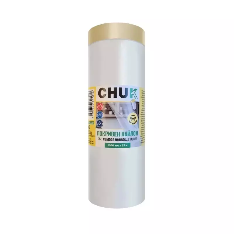 Покривен найлон с висококачествена самозалепваща крепирана лента за бързо и лесно покриване на повърхности в интериора (стени, мебели, врати, прозорци, картини, первази и т.н.) с цел предпазване по време на ремонтни дейности.