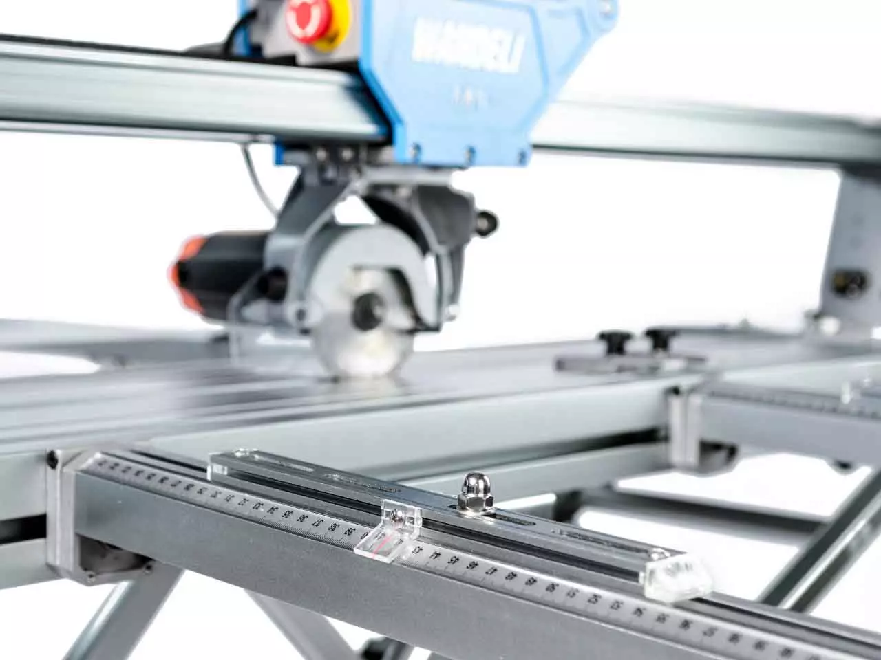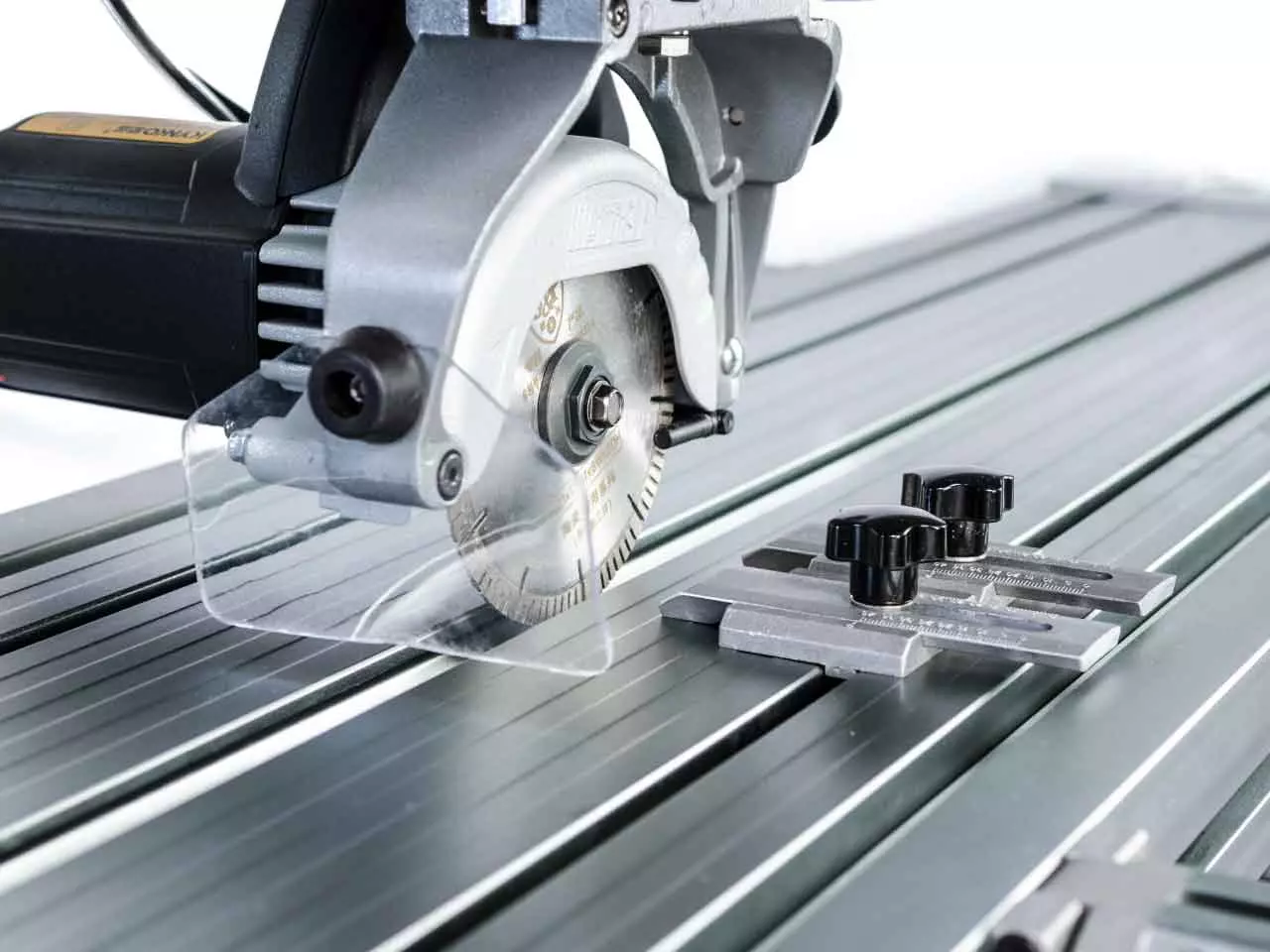 - Повдигнат двигател, който Ви позволява да регулирате дълбочината на рязане и да изрязвате дупки в плочите (максималното разстояние от масата до острието е 12 мм с диск Ø 115 мм)