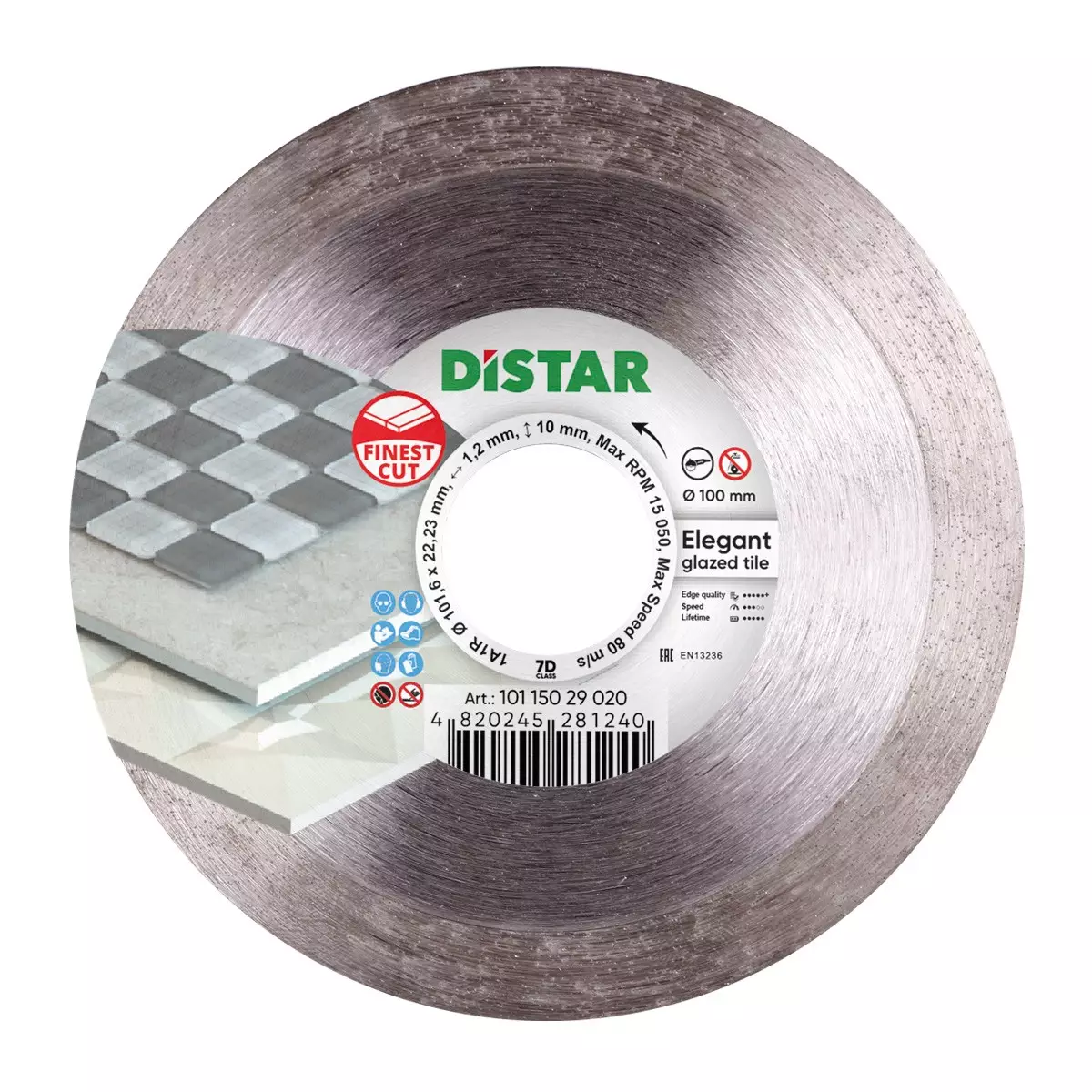 Диамантен диск Elegant е диск прави най-финия срез от цялата серия Distar. Диаметъра на диска Ø100 мм позволява да компенсира всичките вибрации. Дискът е изработен за гланцирани декоративни плочки и полиран гранитогрес.