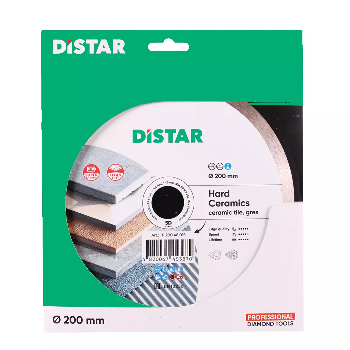 Диамантен диск Distar Hard Ceramics е предназначен за висококачествено рязане на керамични плочки с наличие на декоративно покритие. Скоростта на рязане е 1,1 метра в минута, с живот от 1000 линейни метра.