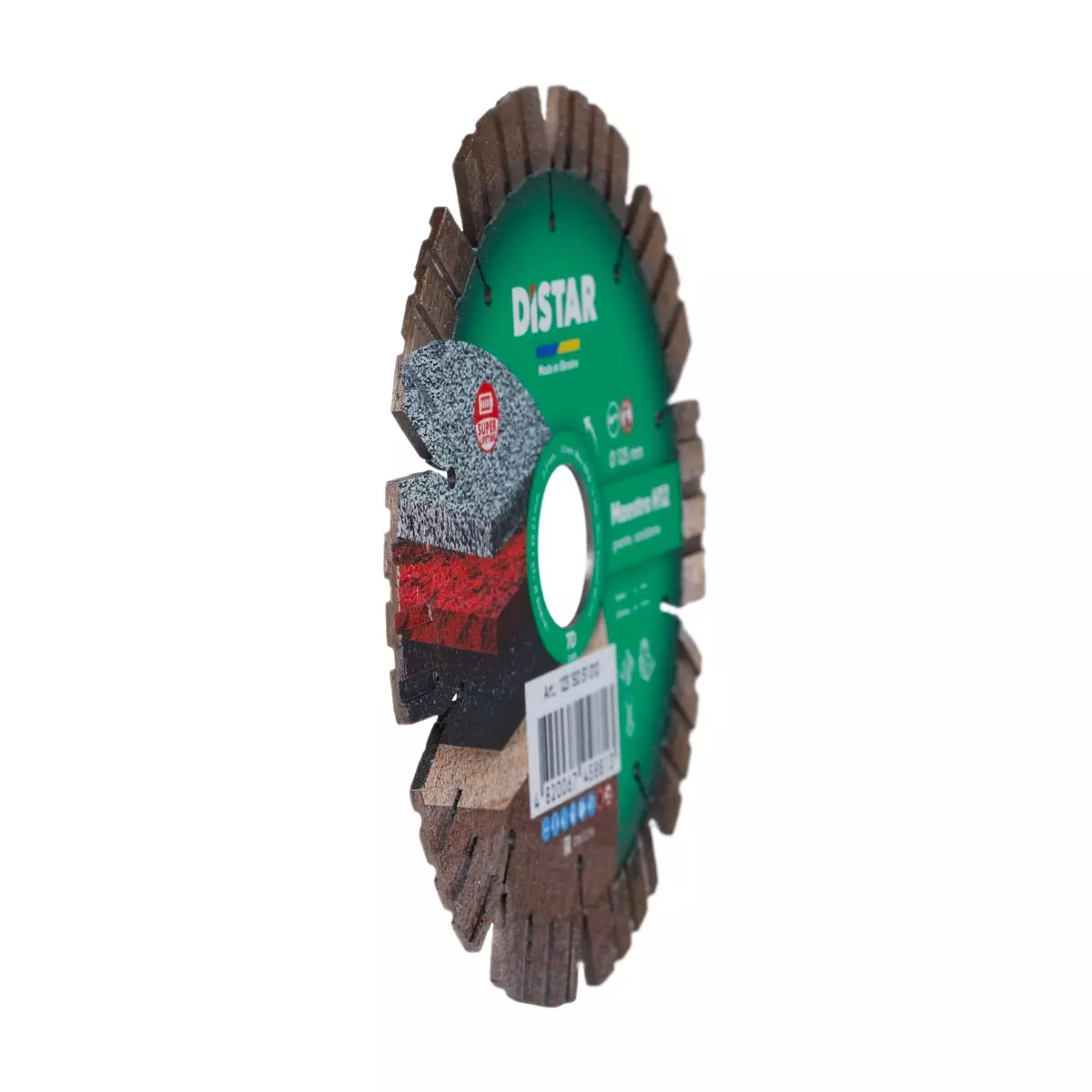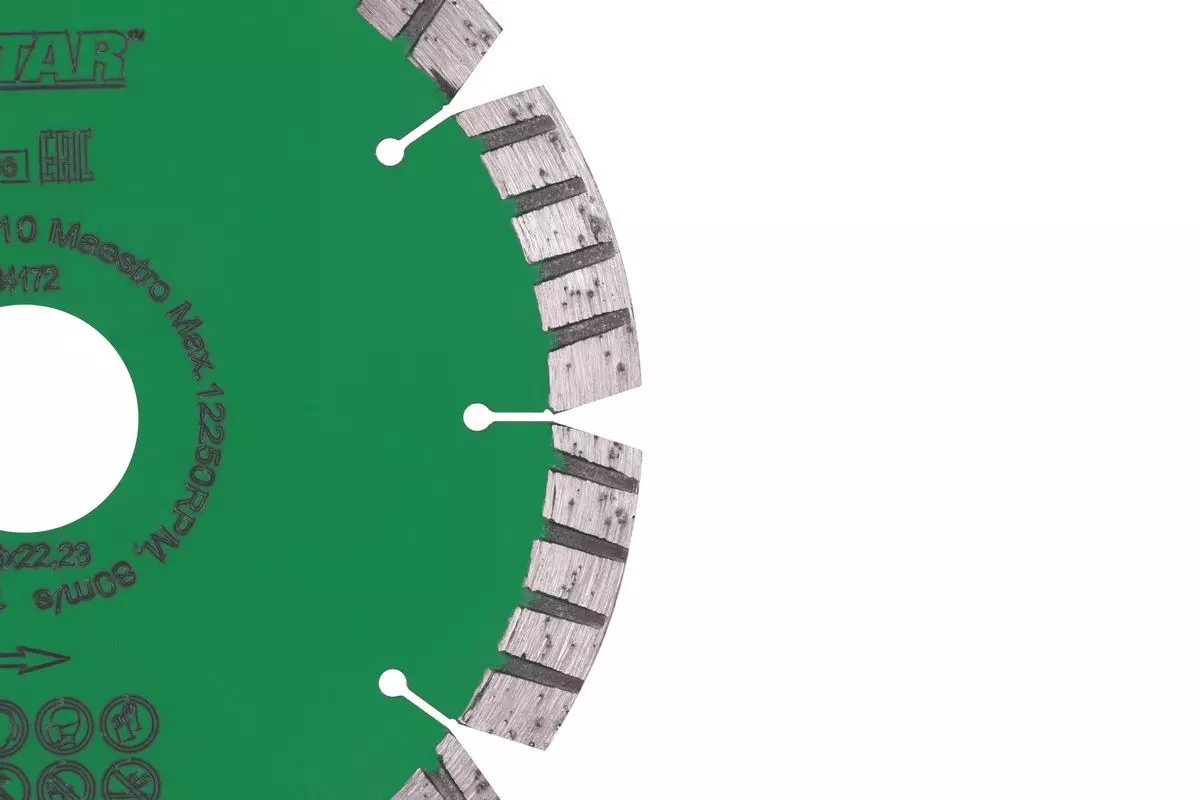 Диамантен диск DISTAR 1A1RSS-W MAESTRO с турбо сегмент е предназначен за рязане на естествен камък, всякакъв вид гранит, мрамор, тухли и пясъчник и твърди скали. Благодарение на височината на диамантения слой от 12 мм, той осигурява максимално възможен живот при сухо рязане. В същото време дебелината на слоя от 2,2 мм ви позволява да работите възможно най-бързо и удобно.