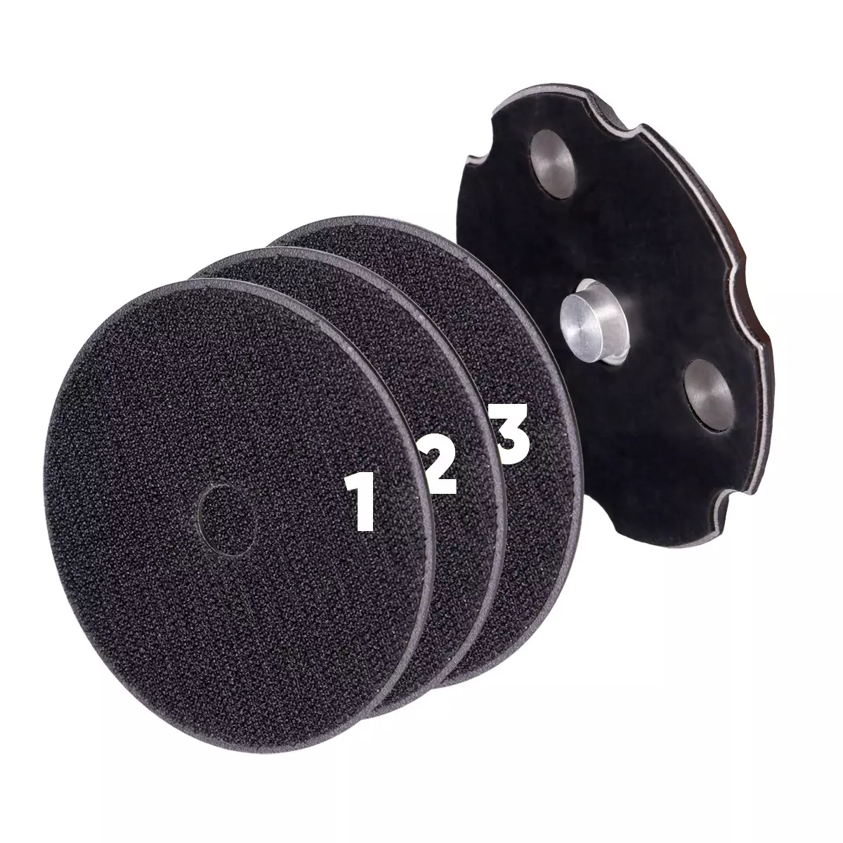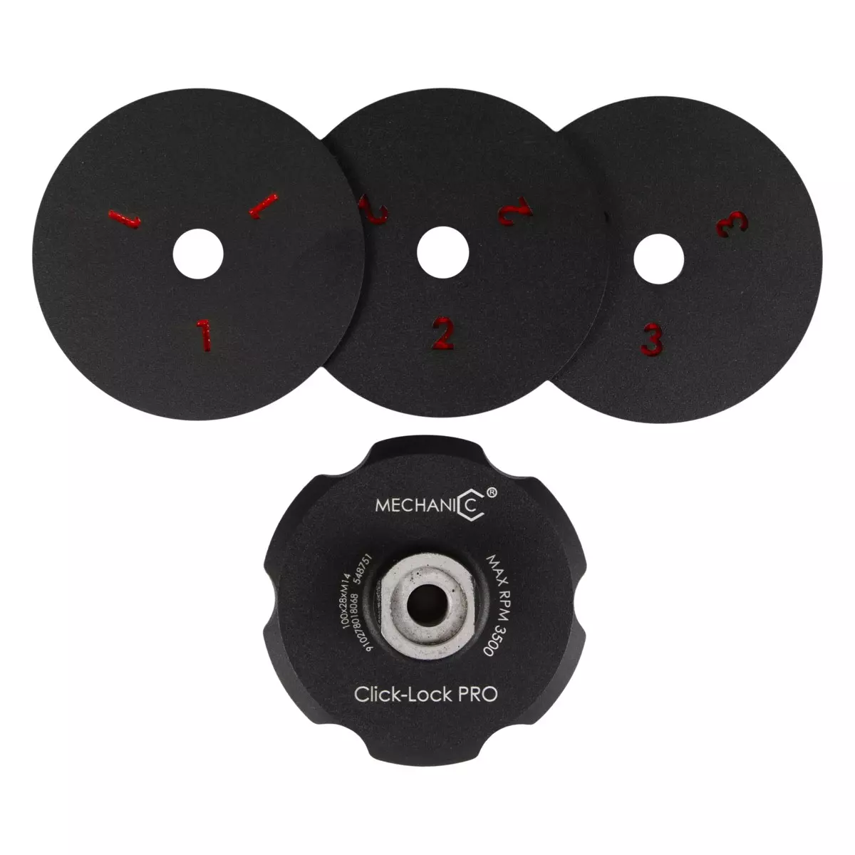 Има външен диаметър 100 mm с M14 монтаж. Комплектът включва основа и три стоманени държача за полиращи диамантени шкурки.