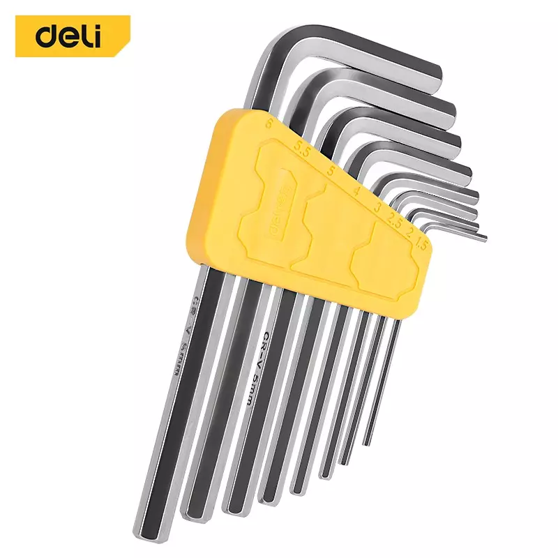 Комплект от най-често използваните размери шестограмни ключове Deli(шестоъгълни ключове). Изработени от качествена хромованадиева стомана (CrV) , закалена по цялата дължина, опаковани в практична кутия.
