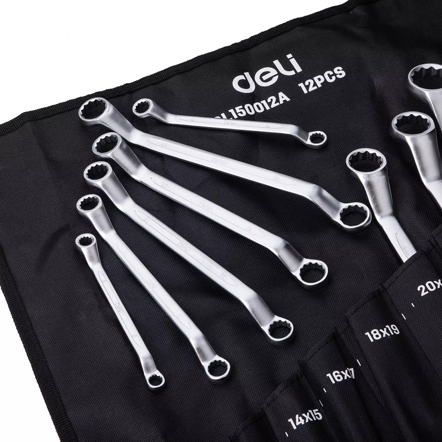 Комплект от 12 двойни звездогаечни ключа с различни размери. Опакован е в практичен, навиваем калъф за компактно съхранение.