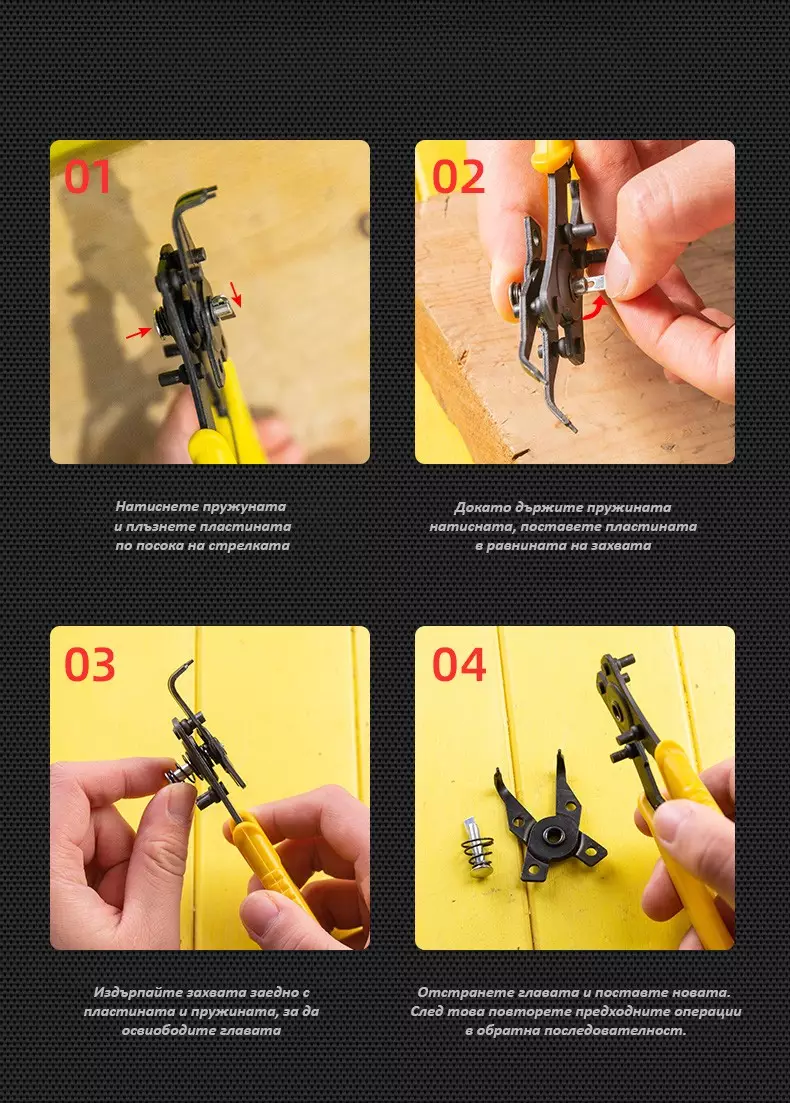 Тези зегер клещи със сменяеми глави са перфектният инструмент за професионалисти и любители, които се нуждаят от универсално решение за работа с различни видове зегери и пружинни скоби.