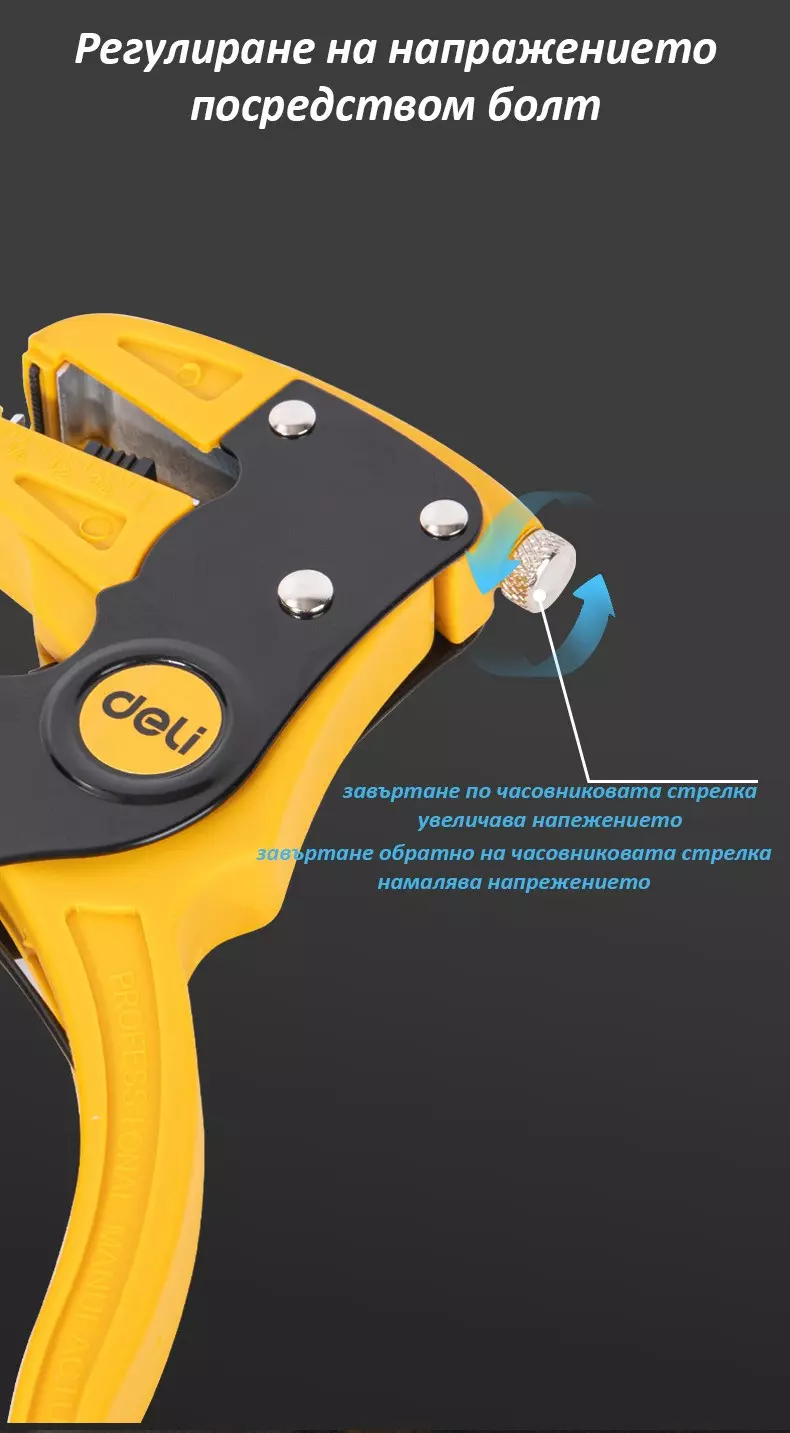 - Регулируемо напрежение: Възможност за настройка на силата на оголване чрез регулатор на напрежението – завъртете по часовниковата стрелка за увеличаване на напрежението или обратно за намаляване.