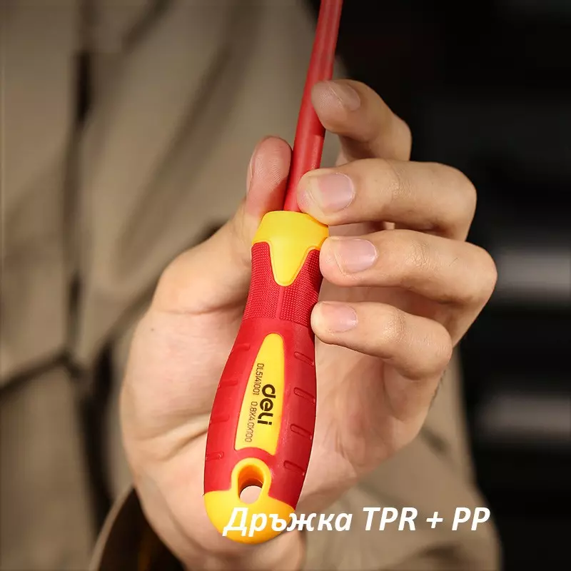 Отвертката Deli EDL5141001 е проектирана за безопасност и ефективност при работа с електрически инсталации. Изработена от висококачествена хром-ванадиева стомана и с иновационна изолирана дръжка, тя осигурява максимална защита при работа с високо напрежение, като същевременно предлага комфорт и дълготрайност. Благодарение на намагнетизирания връх, отвертката лесно задържа болтове и винтове, което улеснява работата и я прави по-ефективна.