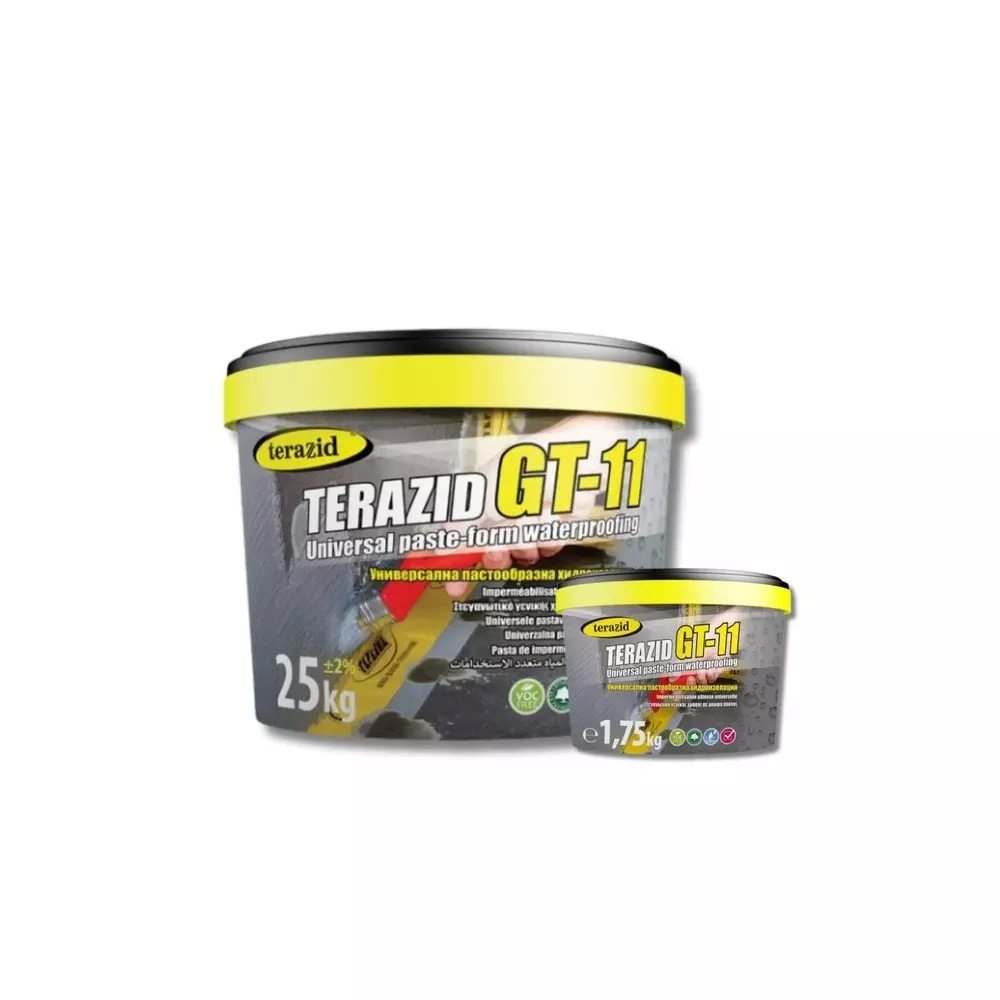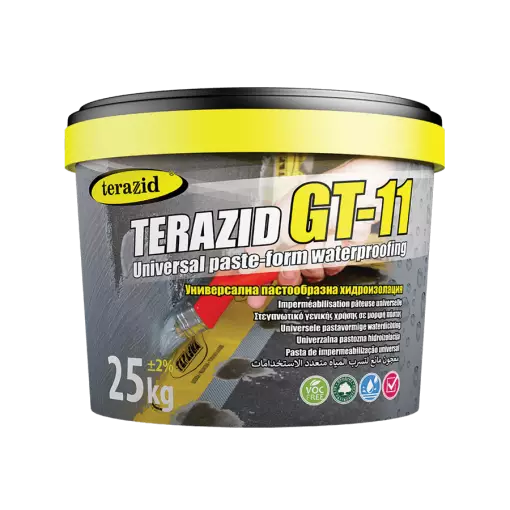 TERAZID GT-11 представлява готова за работа еднокомпонентна пастообразна смес, предназначена за хидроизолация, както на хоризонтални, така и на вертикални елементи от сградата, с изключение на повърхности, подложени на директно слънчево греене. Хидроизолацията се използва най-често във вътрешни помещения, под керамични настилки и облицовки на бани, перални, мокри помещения и други.