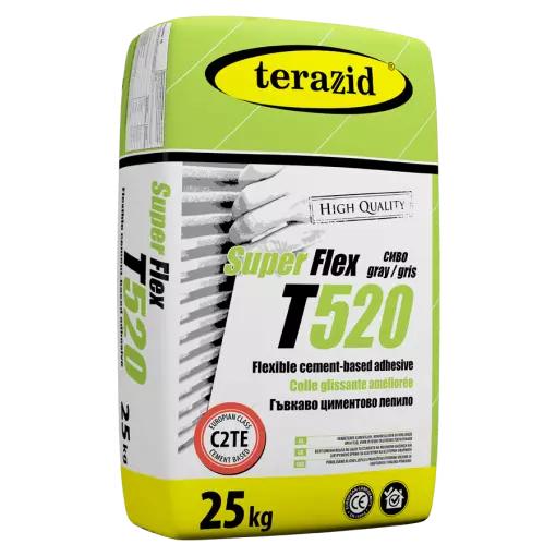 SUPER FLEX T520 е гъвкав циментов разтвор за залепване на фаянс, теракота, гранитогрес и каменни облицовки и настилки. Подобреният състав на лепилото и високите якостни показатели определят приложението му за: