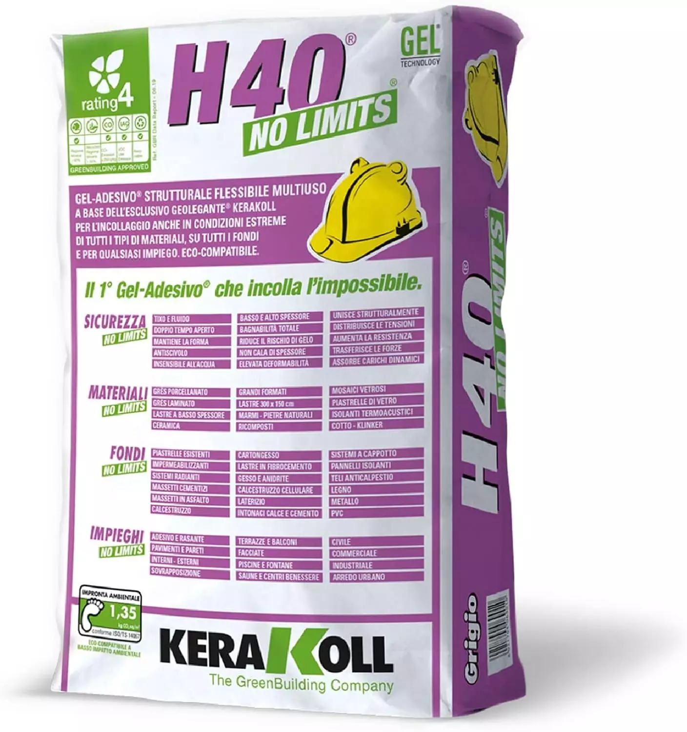 KERAKOLL H40 No Limits (Gel) е иновативно, структурно гел лепило от най-висок клас, проектирано за интензивно професионално натоварване. Създадено по модерна SAS (Shock Absorbing System) технология, то осигурява изключителна адхезия, висока гъвкавост и пълна устойчивост при монтаж на плочи с всякакъв размер – включително ултраголеми формати до 3.00 х 1.50 м. Подходящо за работа върху всички видове повърхности – включително трудни основи като метал, PVC, анхидрит, дърво, както и при условия на интензивна влажност, термични амплитуди и външни натоварвания.