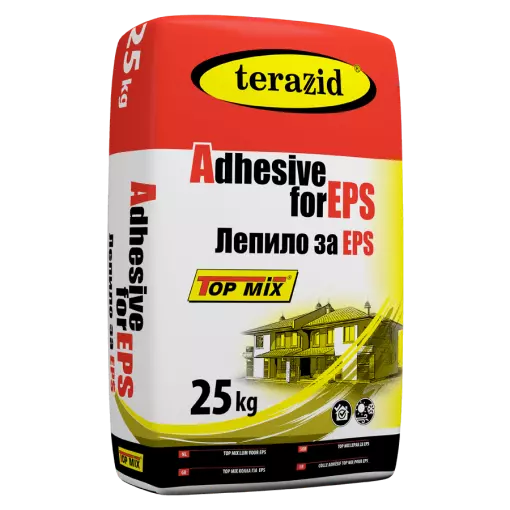 TOP MIX – ЛЕПИЛО ЗА EPS представлява циментова смес, предназначена за залепване на фасадни топлоизолационни плоскости от експандиран пенополистирол (EPS). Материалът е подходящ, както при изграждане на нови фасади, така и при саниране на стари сгради.