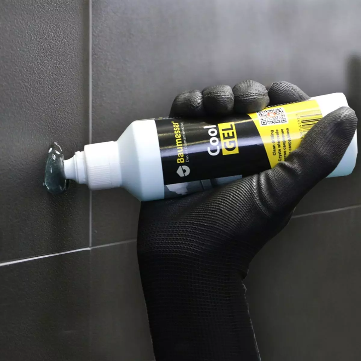 Има решение – охлаждащ гел за пробиване CoolGEL. След маркиране на работната повърхност, гелът се нанася върху зоната на бъдещия отвор. По време на пробиване гелът абсорбира остатъците от рязането – свързвайки ги, за да предотврати разнасянето им наоколо. Освен това има ефективно охлаждане на свредлото, което е толкова добро, колкото водното охлаждане. Това увеличава скоростта на пробиване и поддържа дълъг живот на свредлата. След пробиване е достатъчно да избършете зоната на пробиване със салфетка и всичко е чисто и сухо.
